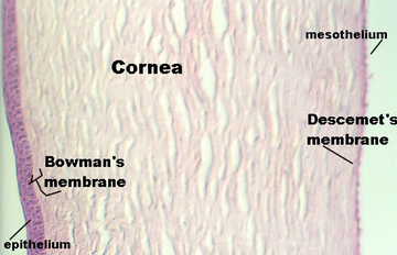 As you study your eye slide, move from the conjunctival fornix to the anterior region of the cornea. An overview of the cornea proper is shown below. The thicker epithelium is facing anteriorly (left). (Therefore, the outside of the eye would be to the left.) Underneath the epithelium is Bowman's membrane, which is a condensed region that begins the cornea proper. Finally Descemet's membrane lies at the opposite side, just underneath the mesothelium. The anterior chamber faces to the right. The following photograph shows these structures in greater detail. Compare it with Figures from your text.