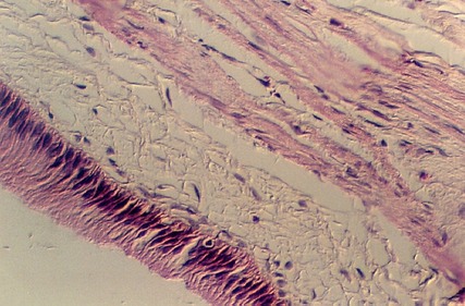 The following slide shows an empty gall bladder. Note that the MUCOSA is stretched out in the distended gall bladder and thrown into many folds in the empty organ. The epithelium is simple columnar with a small brush border. There is no muscularis mucosa. Underneath the epithelium is the submucosa. The muscularis externa consists of irregularly interwoven strands of smooth muscle, collagenous and elastic fibers. The following figure shows the distended gall bladder.