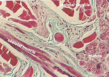 This view shows a higher magnification of the dermis of the tongue. Mucous glands and striated muscle are evident. You may also find a number of peripheral nerves.